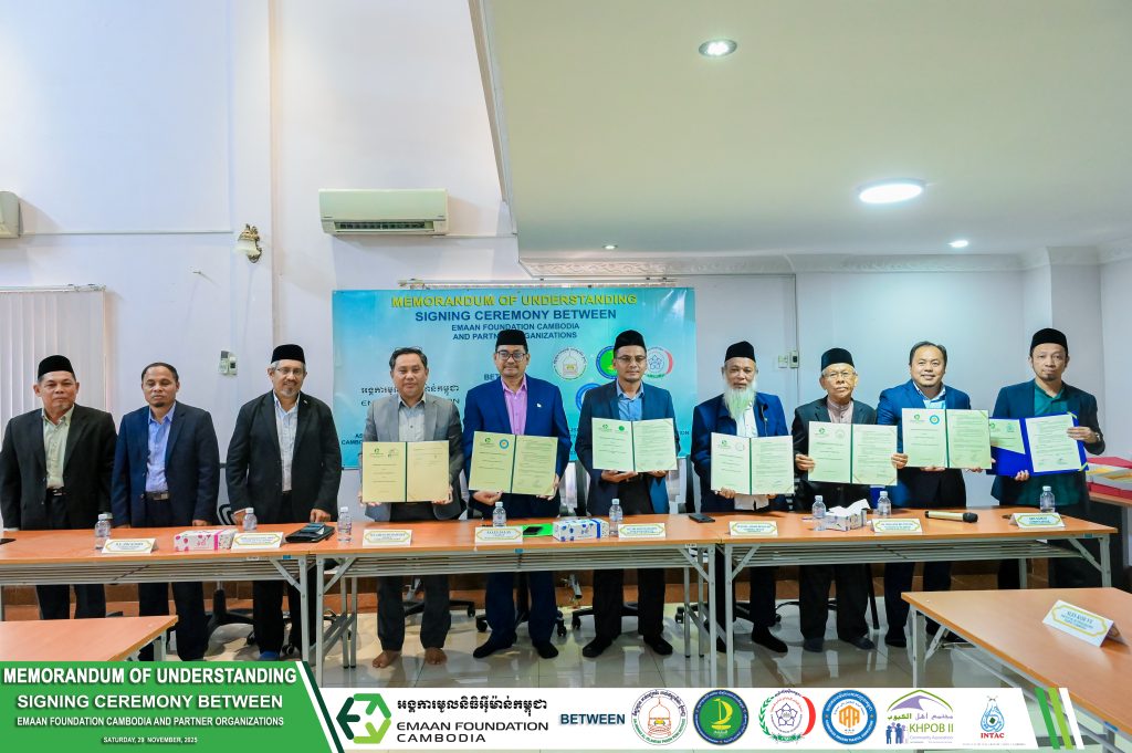 [English Below] ពិធីចុះហត្ថលេខាលើអនុស្សារណៈយោគយល់ (MoU) រវាងអង្គការមូលនិធិអុីម៉ាន់កម្ពុជា និងអង្គការ សមាគមន៍ និងស្ថាប័នអប់រំ នៅព្រឹកថ្ងៃសៅរ៍ ទី២៩ ខែវិច្ឆិកា ឆ្នាំ២០២៥ អង្គការមូលនិធិអុីម៉ាន់កម្ពុជាបានរៀបចំពិធីចុះហត្ថលេខាលើអនុស្សារណៈយោគយល់ (MoU) រវាងអង្គការ សមាគមន៍ និងស្ថាប័នអប់រំ សរុបចំនួន ៦ស្ថាប័ន ក្នុងនោះរួមមាន៖ ១.អង្គការមូលនិធិអាស៊ាន ដើម្បីការអប់រំ និងអភិវឌ្ឍន៍ (AFED) ២.វិទ្យាស្ថាន អាន់នីកម៉ះ អាល់ឥស្លាមីយ៉ះ ភ្នំពេញ ៣.សមាគមអាម៉ាណះ តាកាហ្វុល កម្ពុជា (CATA) ៤.សមាគមន៍កូប៉ា្រសុីមូស្លីមកម្ពុជា (CMC) ៥.សហគមន៍ ខ្ពួប ២ (KCA) ៦.និងសាលាអន្តរជាតិ អុិនតាច(INTAC) ពិធីចុះហត្ថលេខានេះ គឺជាជំហានមួយដ៏មានតម្លៃក្នុងការធ្វើការងាររួមគ្នា ដោយផ្តោតលើពង្រឹងគុណភាពអប់រំ និង ការអភិវឌ្ឍសហគមន៍ ឱ្យកាន់តែប្រសើរឡើង។ Signing Ceremony of the Memorandum of Understanding (MoU) between Emaan Cambodia Foundation and Partner Organizations On Saturday morning, November 29, 2025, Emaan Cambodia Foundation organized a signing ceremony of the Memorandum of Understanding (MoU) with 6 partner organizations which include: 1.ASEAN Foundation for Education and Development(AFED) 2.An-Nikmah Al-Islamiyah Phnom Penh Institute 3.Cambodia Amanah Takaful Association(CATA) 4.Cambodian Muslim Cooperatives(CMC) 5.Khpob II Community Association (KCA) 6. Institute of Integrated Tahfiz Cambodia (INTAC) This signing ceremony represents a valuable step towards working collaboratively, focusing on strengthening the quality education and improving community development.